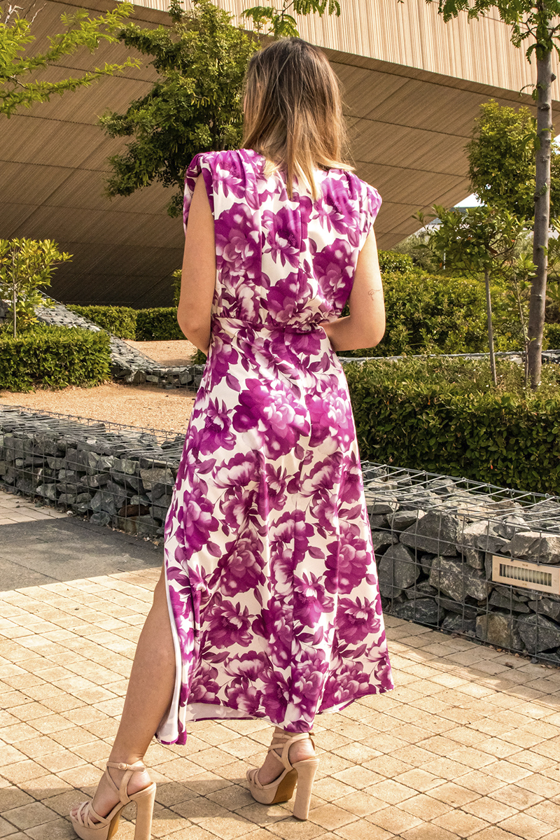 Una nueva edición del TOP VENTAS Aurora. Ahora lo tienes en un espectacular estampado floral con hombreras y cremallera… elegancia y distinción con este vestido midi.